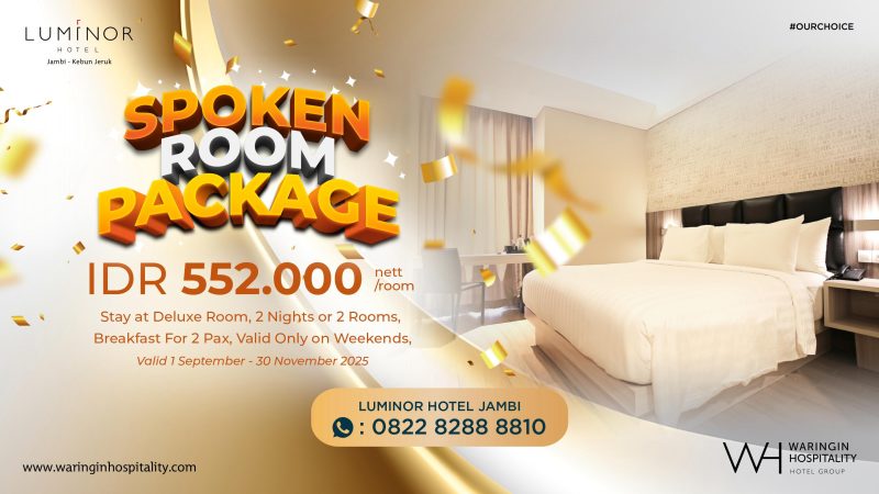 JURNALELITE.COM, JAMBI,- Luminor Hotel Jambi kembali menghadirkan kejutan spesial untuk Anda yang ingin menikmati staycation menyenangkan tanpa harus merogoh kocek dalam! Melalui promo “Spoken Room Package”, Luminor Hotel Jambi menawarkan pengalaman menginap penuh kenyamanan dengan harga super hemat — hanya IDR 552.000 nett/room.